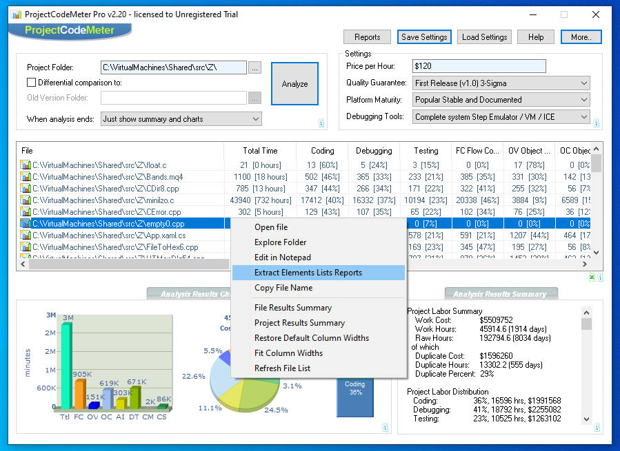 The results of the development time and cost estimation are shown at the bottom of the screen, both as Charts (bottom left) and as a Summary (bottom right).